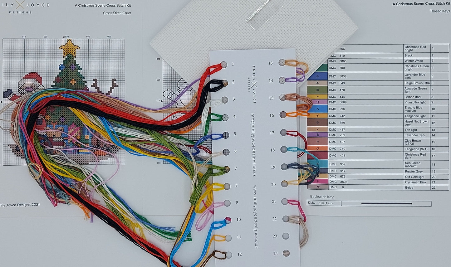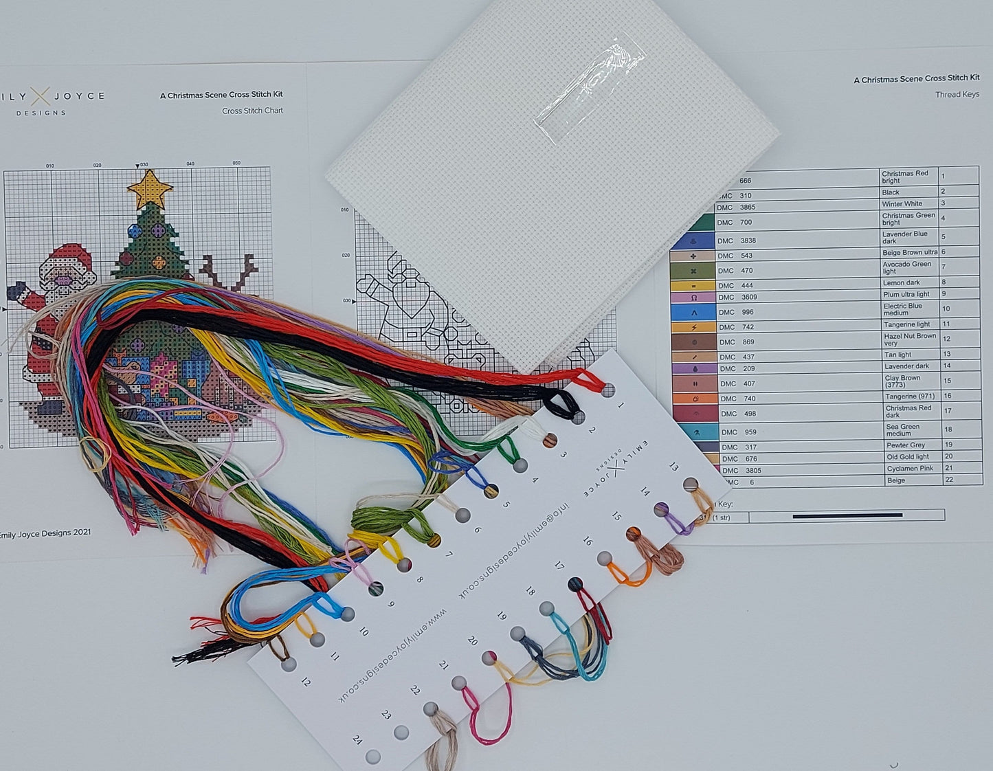 A bright and modern cross stitch kit featuring a Christmas scene. Kit contains an A5 fold out colour instruction book complete with colour chart, a backstitch chart, key and clear instructions. The kit also includes 14 count white Aida, pre-sorted DMC stranded cottons and a needle.